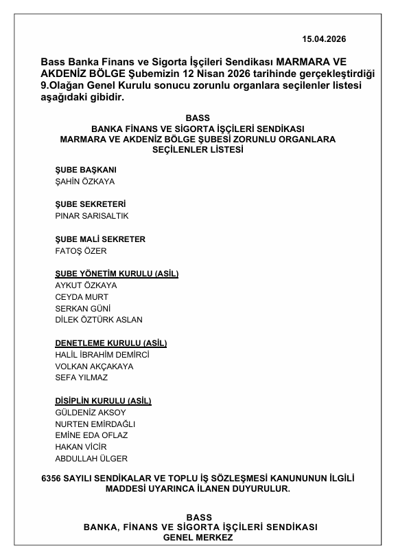 BASS Marmara ve Akdeniz Bölge Şubemizin 9.Olağan Genel Kurulu Sonuç İlanı | Bass
